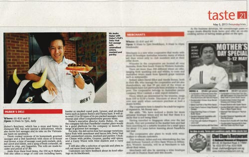 "Huber's Butchery, which has a store and bistro in Dempsey Hill, has now opened a delicatessen, which also serves hot sausages and its take on the Vietnamese bahn mi sandwich." The Sunday Times, 5th May 2013
