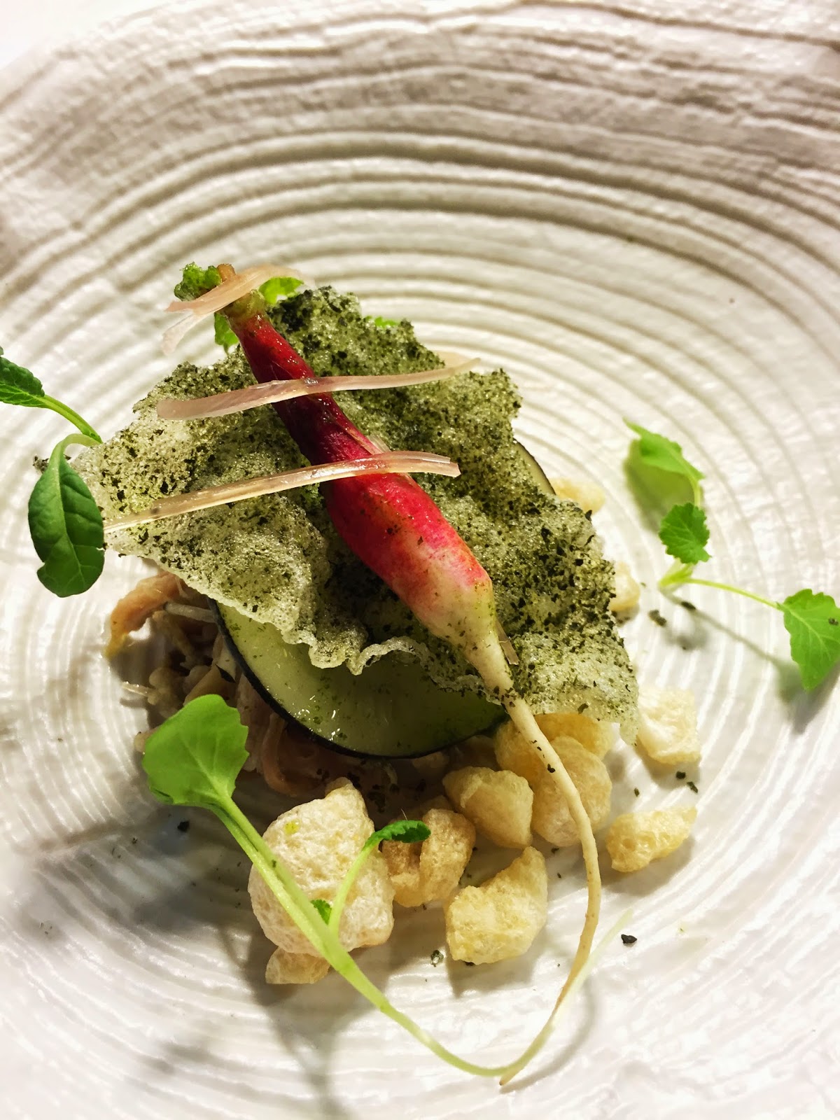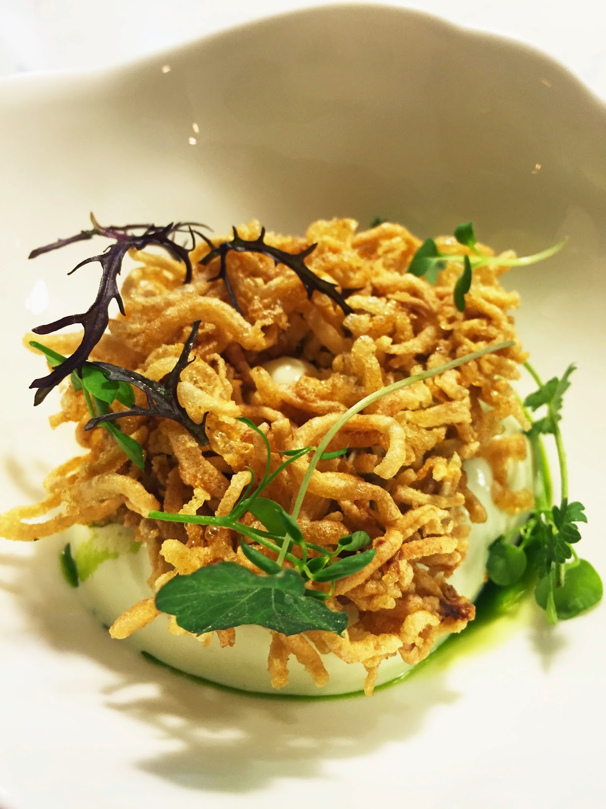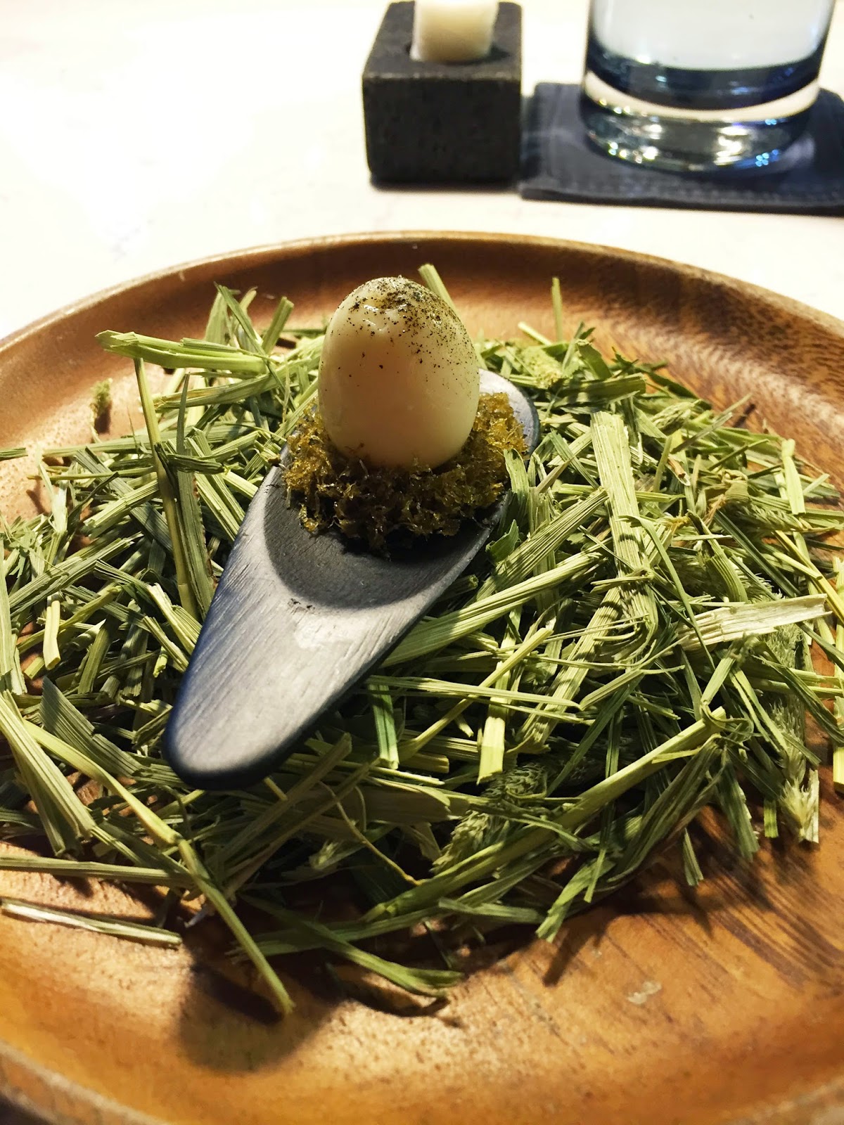 Feeling hungry and ready for a gastronomic adventure, I went for the 10 course Gourmand menu. About 5 minutes after ordering, the first of many snacks came our way. We had salted fish with seaweed cracker, curry pops, peppers in charcoal dust, smoked quail’s egg and tomato lava lamp. I thought the flavour of the peppers coated with charcoal dust and deep fried was really good. The tomato juice with olive oil and basil was really interesting as blobs of green basil could be seen rising to the surface, very much like a lava lamp.