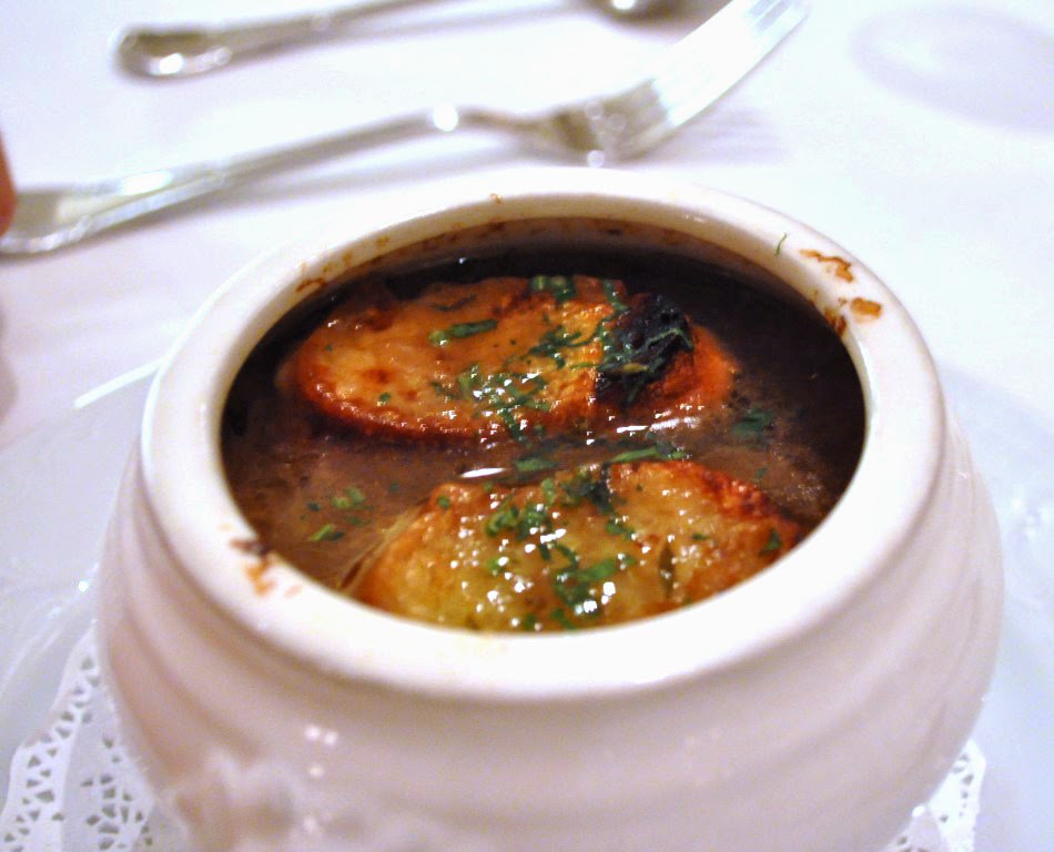 Grandpa Henri’s onion soup served gratineed with bread and cheese on top |