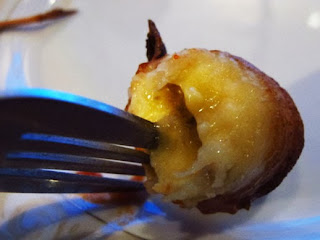 The Banana Bacon Bites were just that, banana chunks rolled in bacon and then deep-fried. It came with barbecue sauce and a bowl of side-salad. A serving consists of 6 banana bacon bites each slightly bigger than my thumb. They were quickly dispatched of. The Knight's Signature Potato Skins were also 6 bite-sized morsels. These tasty deep-fried snacks with mozzarella were also snapped up quickly.