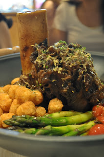 For the main, we ordered the signature beef shank. This dish is not for small parties as it serves 4 to 6 persons. I think this is the first time I have ordered a dish that is to be shared by more than 2 to 3 persons. It is not easy to get 4 to 6 people to agree to eat the same thing but thankfully it is for a family of butchers. The beef shank is a 3 to 4kg beast that has been frenched to create a lollipop look. The meat is braised and swimming in its finger licking juices. It is served in a large deep pan with mashed potato, roasted cherry tomatoes, asparagus and tater tots. Before I go any further, one word of advice is to portion out all the sides onto the individual plates before cutting the beef. Failure to do so will leave one watery mess. I actually enjoyed the mash potato with the gravy but it does injustice to the tater tots. Tater tots is a registered product in the USA and was created in 1953. It is basically grated potato made into a small size cylindrical shape that is then deep fried till crispy. Think hash brown in a cylindrical shape. The beef shank is a tough cut of meat with a good amount of white connective tissue (collagen) however when braised, produces tender and flavour meat. At the butchery, we sell this as shin shank cubes for stew. The best part of the shank is the marrow located within the bone. Senior Huber, true to his butcher background promptly removed the marrow by unglamorously blowing it out and finishing it all himself! Thanks dad….