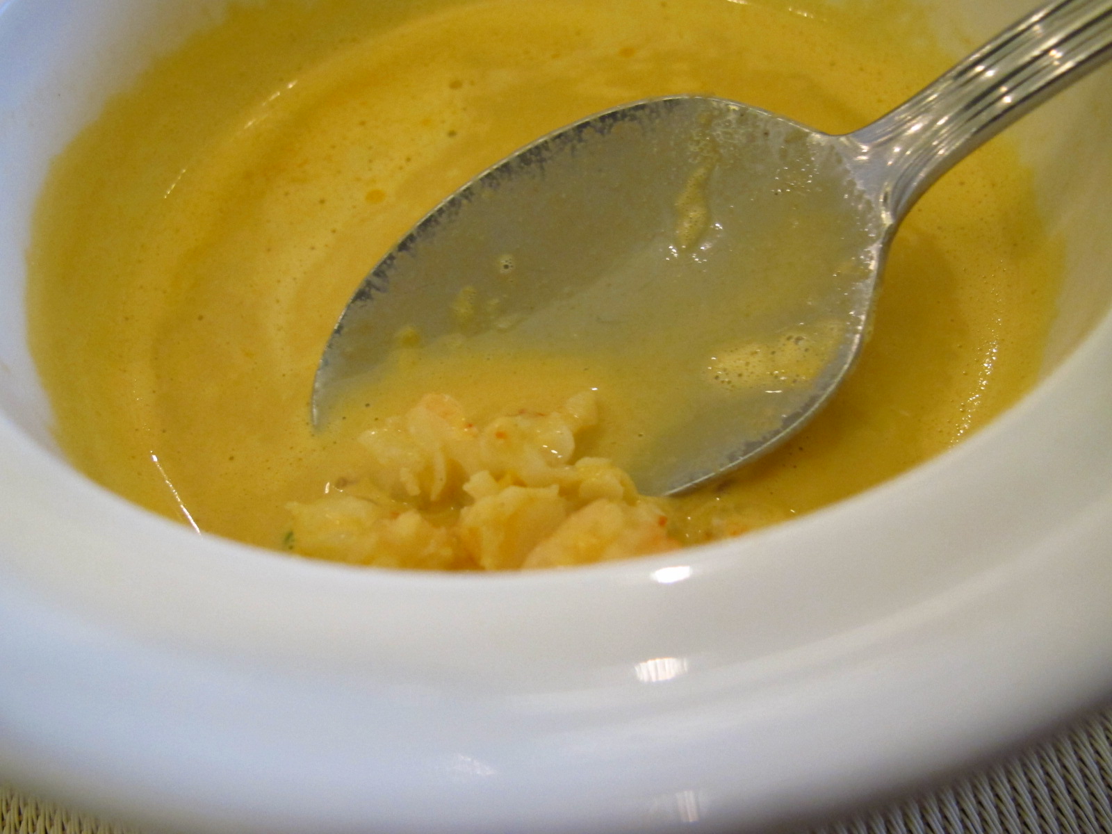 We arrived minutes before 6 and getting a parking lot was a breeze. We were greeted by an immaculately dressed wait staff who wore her hair neatly pulled back into a bun. I was disappointed to hear from her that the King Prawn Salad with Avocado was not available and so our menu for the day was: a Lobster Bisque, Crab Meat with Mayonnaise and Pomelo, Crispy Oven-baked Pork Trotter with Mushroom Fricassée and Grilled Lamb Cutlet with Ratatouille.